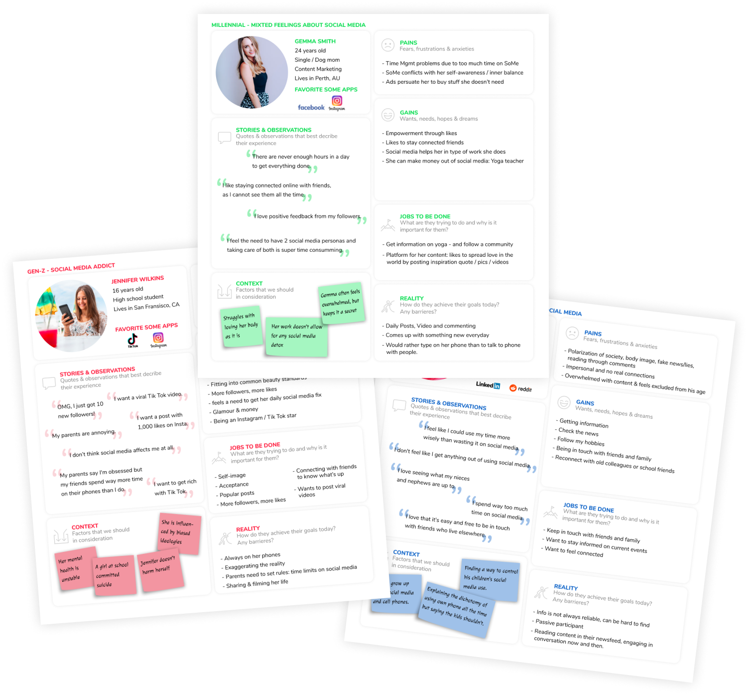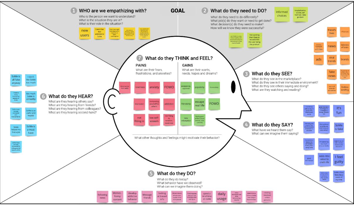 To understand and connect even more with our typical social media users, we developed 3 personas and an empathy map.