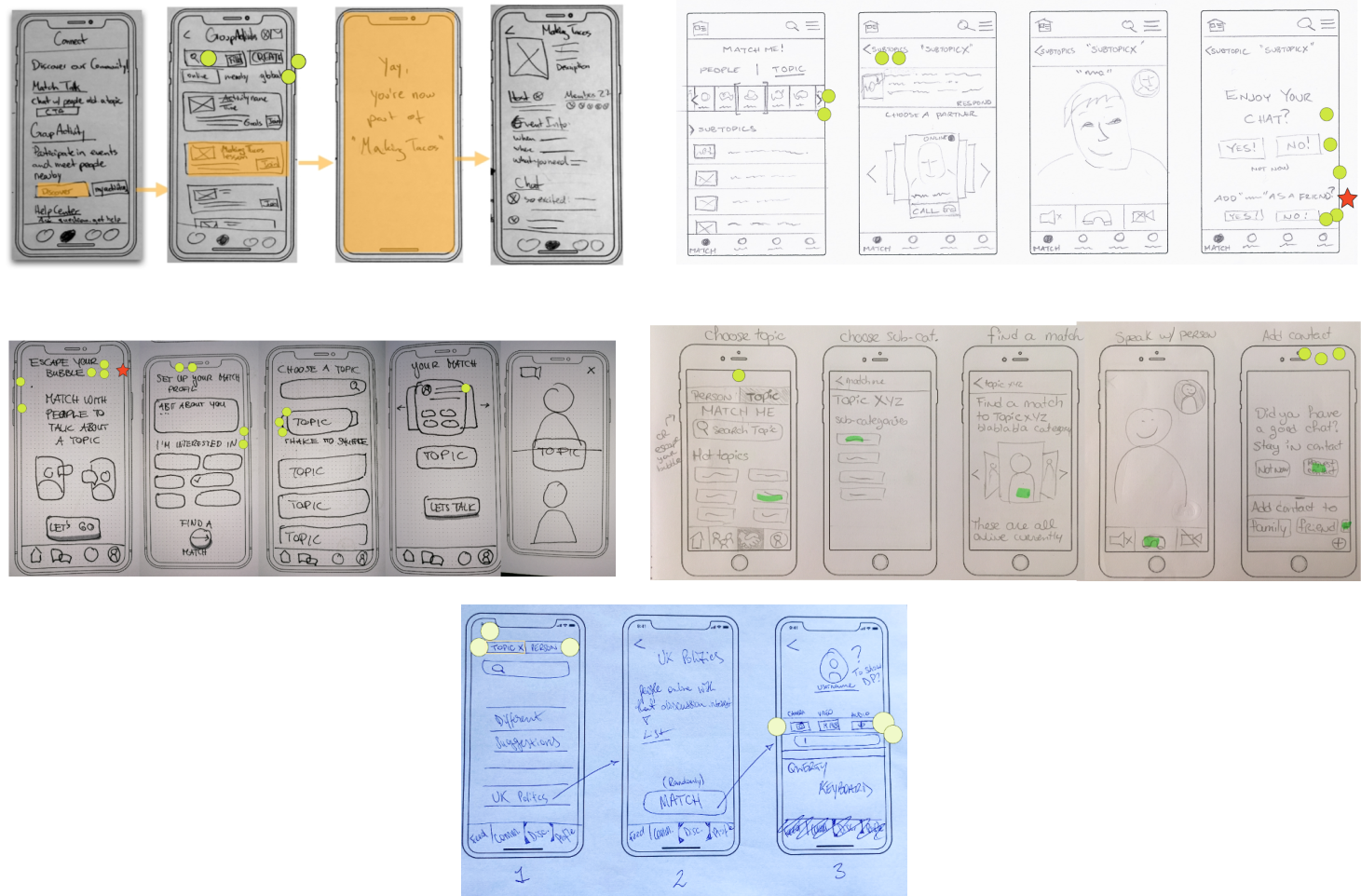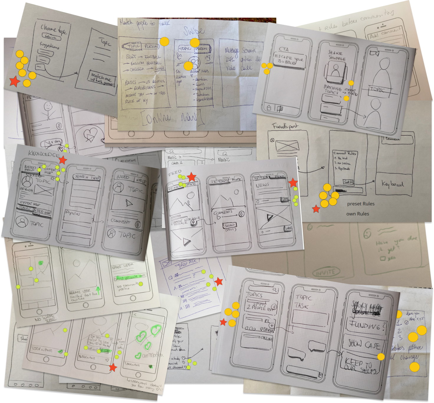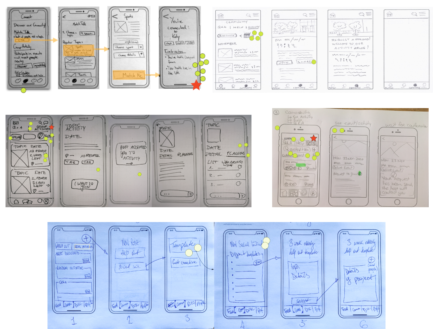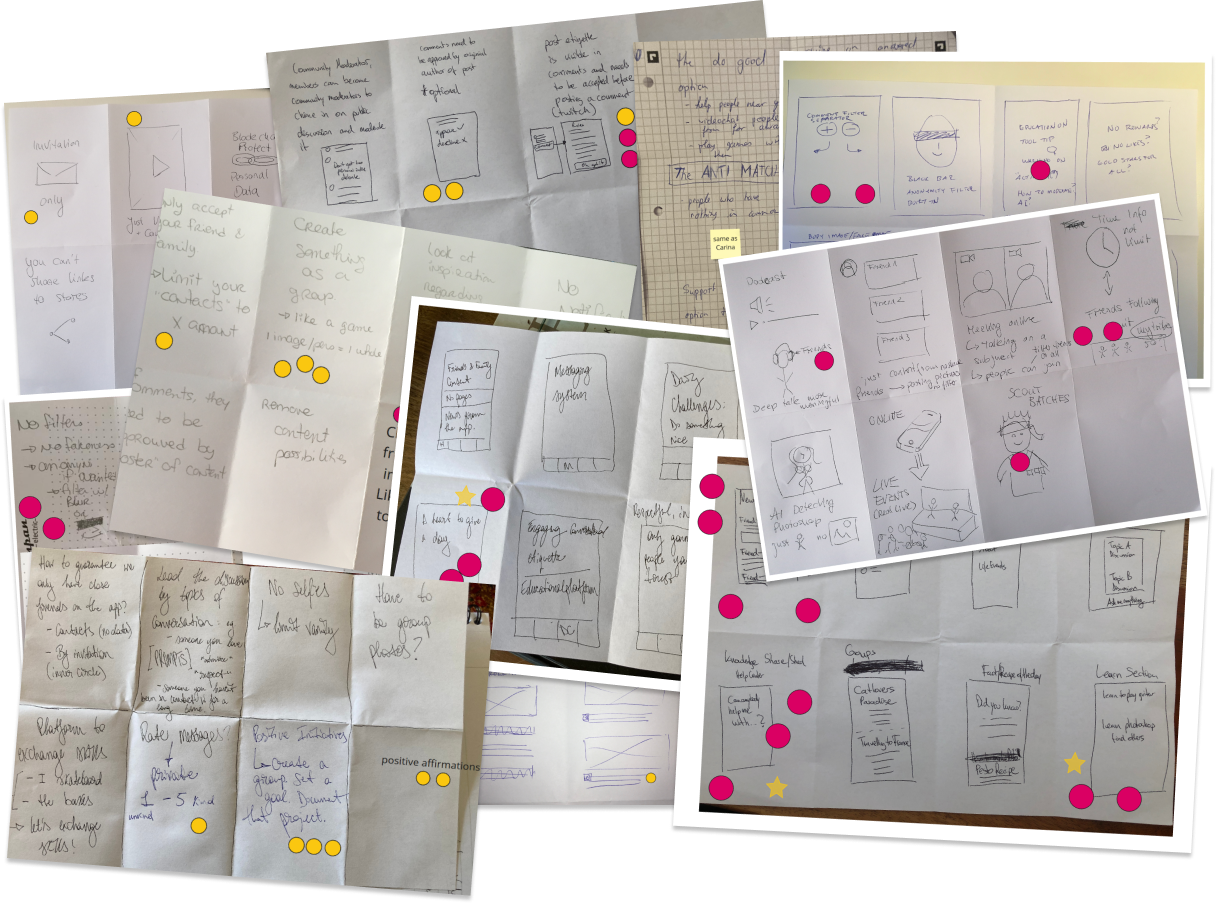 Getting a better picture of the features by sketching some wireflows was crucial to shape our future prototype. We concentrated on our previously voted features: Feed, Match & Community. We sketched some more, voted on our favorite screens and developed those ideas further.