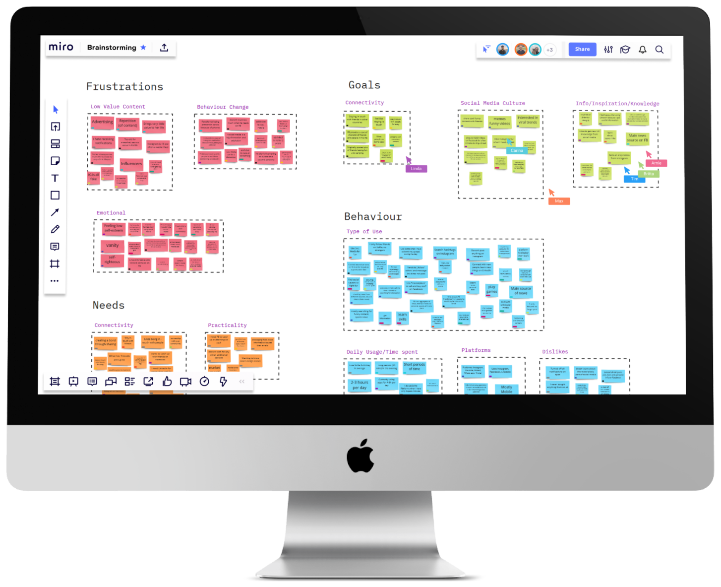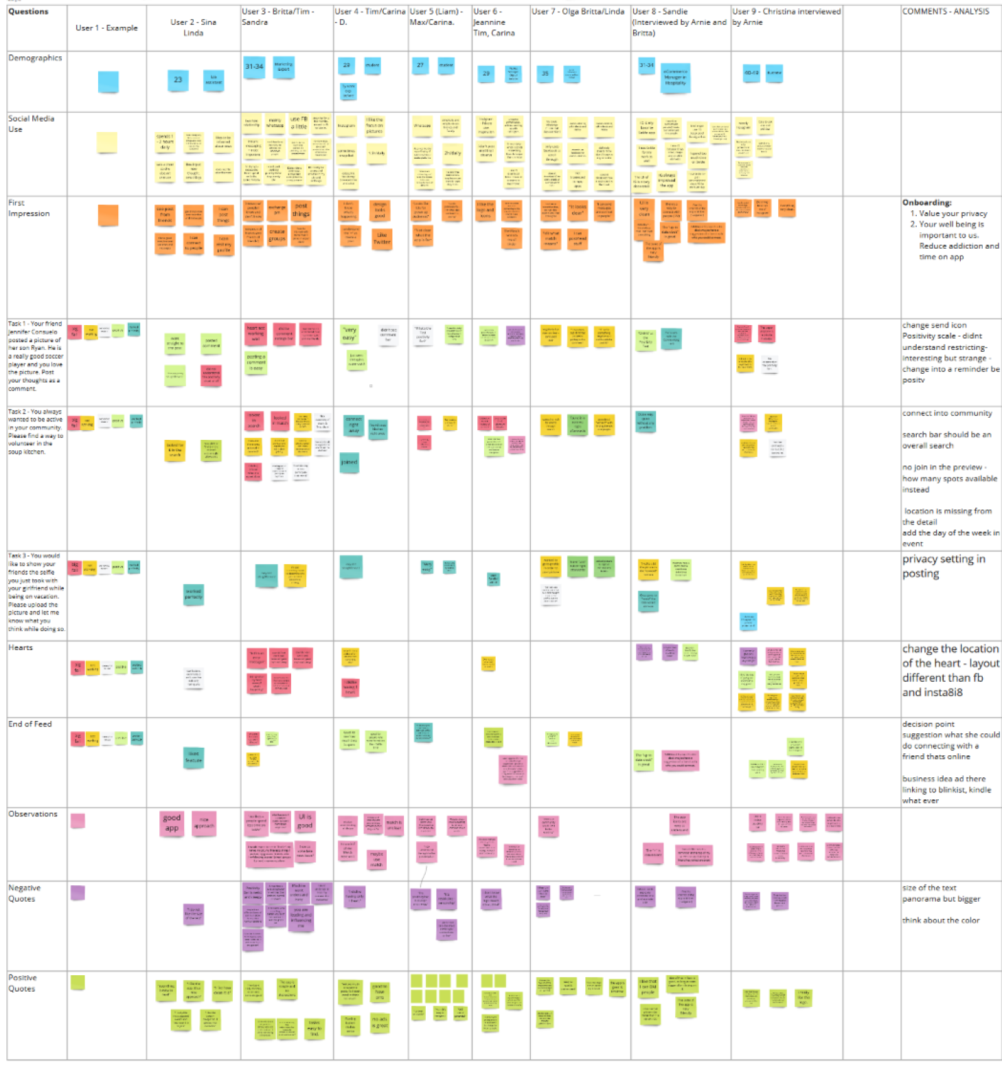 We each interviewed 1-3 social media users and gathered valuable feedback. In order to also receive quantitative user research, we created a survey with 10 questions from which we received 108 answers. We also had priceless insights from the Netflix documentary “The Social Dilemma”. After we extracted all the answers, we clustered them into different categories.