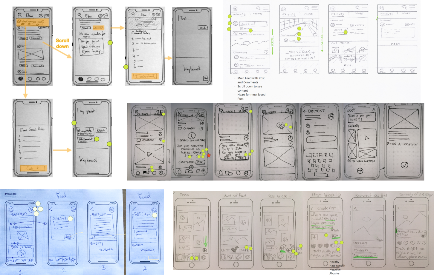 We then took the top 3 features: communication, speak openly as well as etiquette/policy and started sketching ideas with the “Crazy 8s” method. We voted on the best ideas and continued by sketching screens for each popular element. We did this procedure twice, starting again with the “Crazy 8s”.