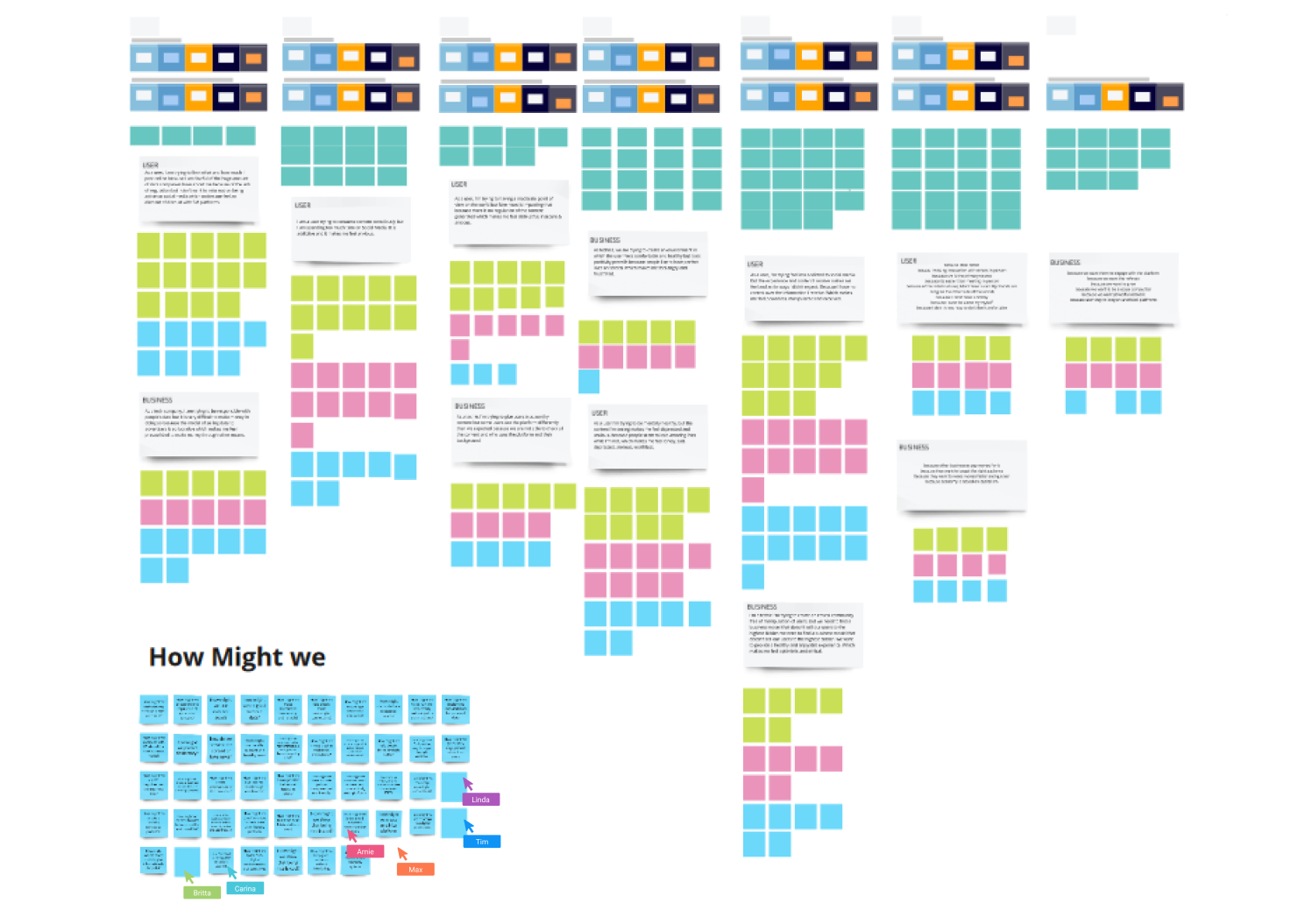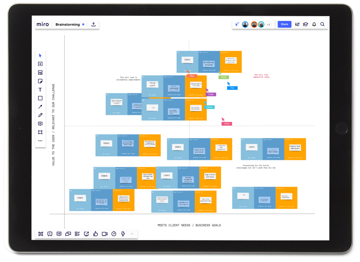 In order to find a great solution, we needed to properly understand all the problems from different point of views. We extracted all the problems from the businesses as well as the ones from the users which we found during our research and digged dip, into the core of the situation, asking 5 times “why”. Taking the negative of the problem, turning it into something positive and from those statements, we created meaningful “How Might We” questions. The most important “HMW” were prioritized into the same type of matrix as the step above. Then it was time to brainstorm some solutions which we clustered into features and once again prioritized between “unwise, “big bets” and “no-brainer”.