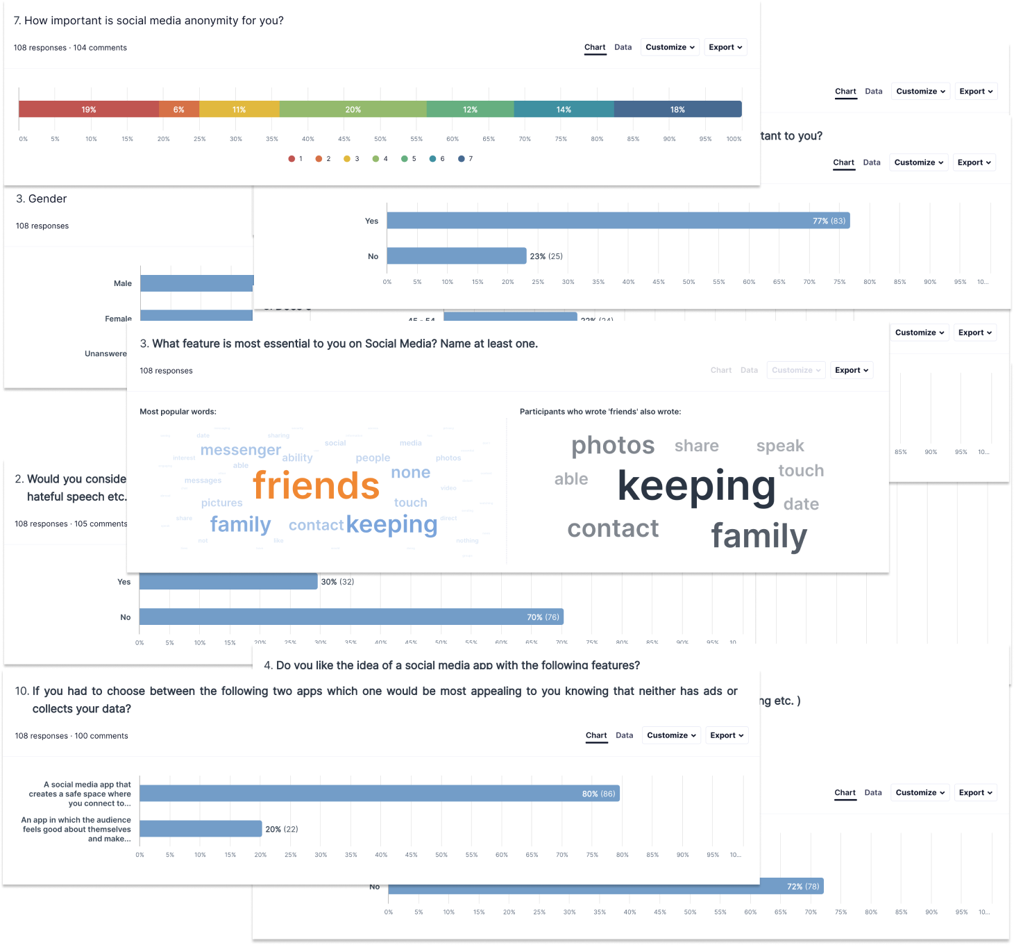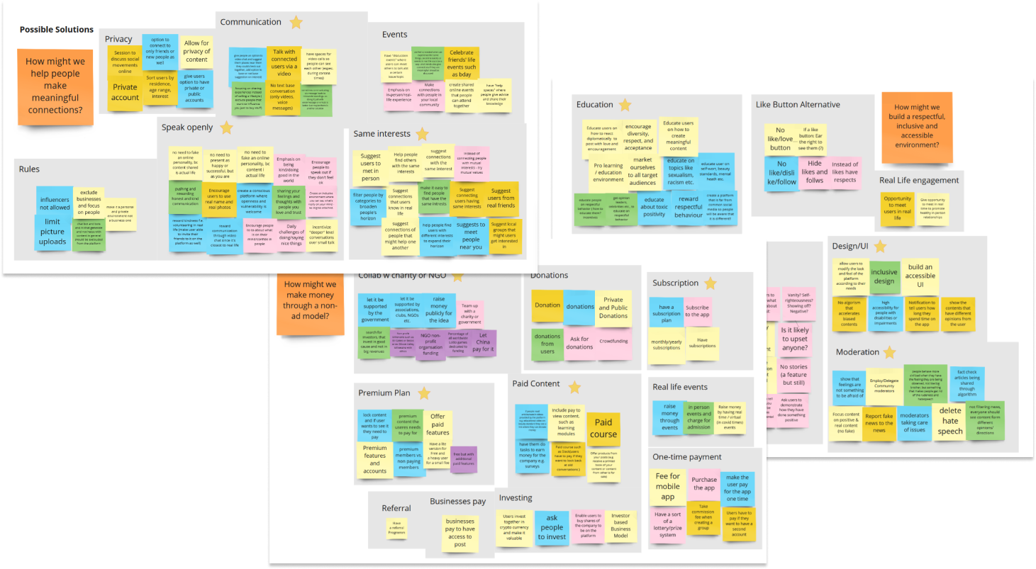 We each interviewed 1-3 social media users and gathered valuable feedback. In order to also receive quantitative user research, we created a survey with 10 questions, from which we received 108 answers. We also had priceless insights from the Netflix documentary “The Social Dilemma”. After we extracted all the answers, we clustered them into different categories.