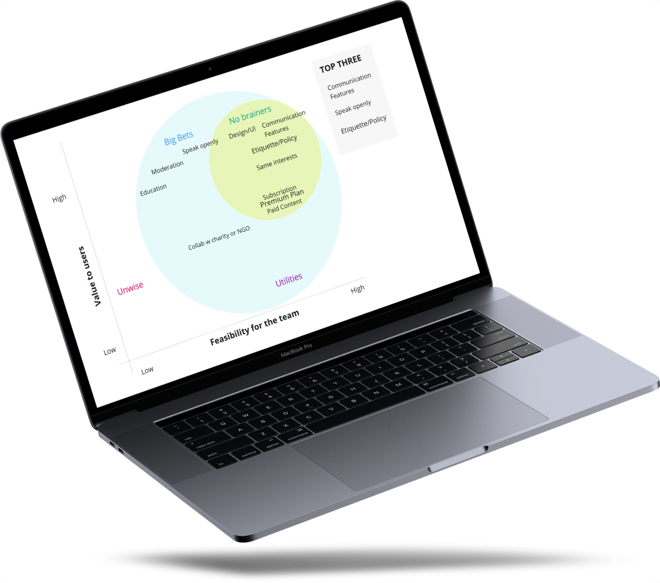Our users and the business side both have many needs, so we made a long list of user stories. Prioritizing them was the next step: on the below matrix, we placed the most valuable need statements, which we voted on, to see what brought the most value to the users and met best the clients / business goals. This was important in order to see in which direction our app would develop.