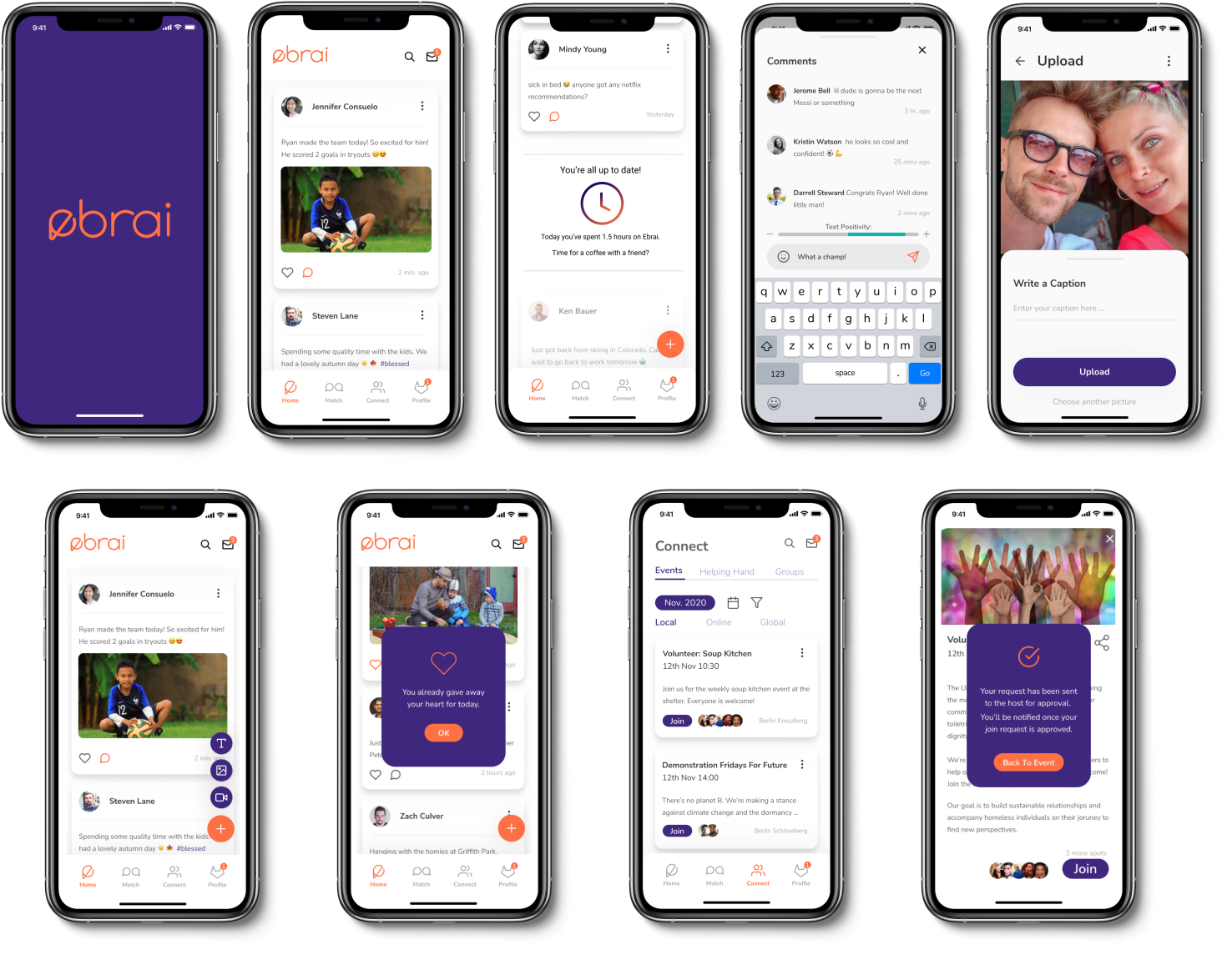 Our prototype was generally well perceived, although most participants were very surprised by the 1 heart a day concept, were confused about the “text positivity” scale and didn’t know the difference between the navigation points “match” and “connect”.